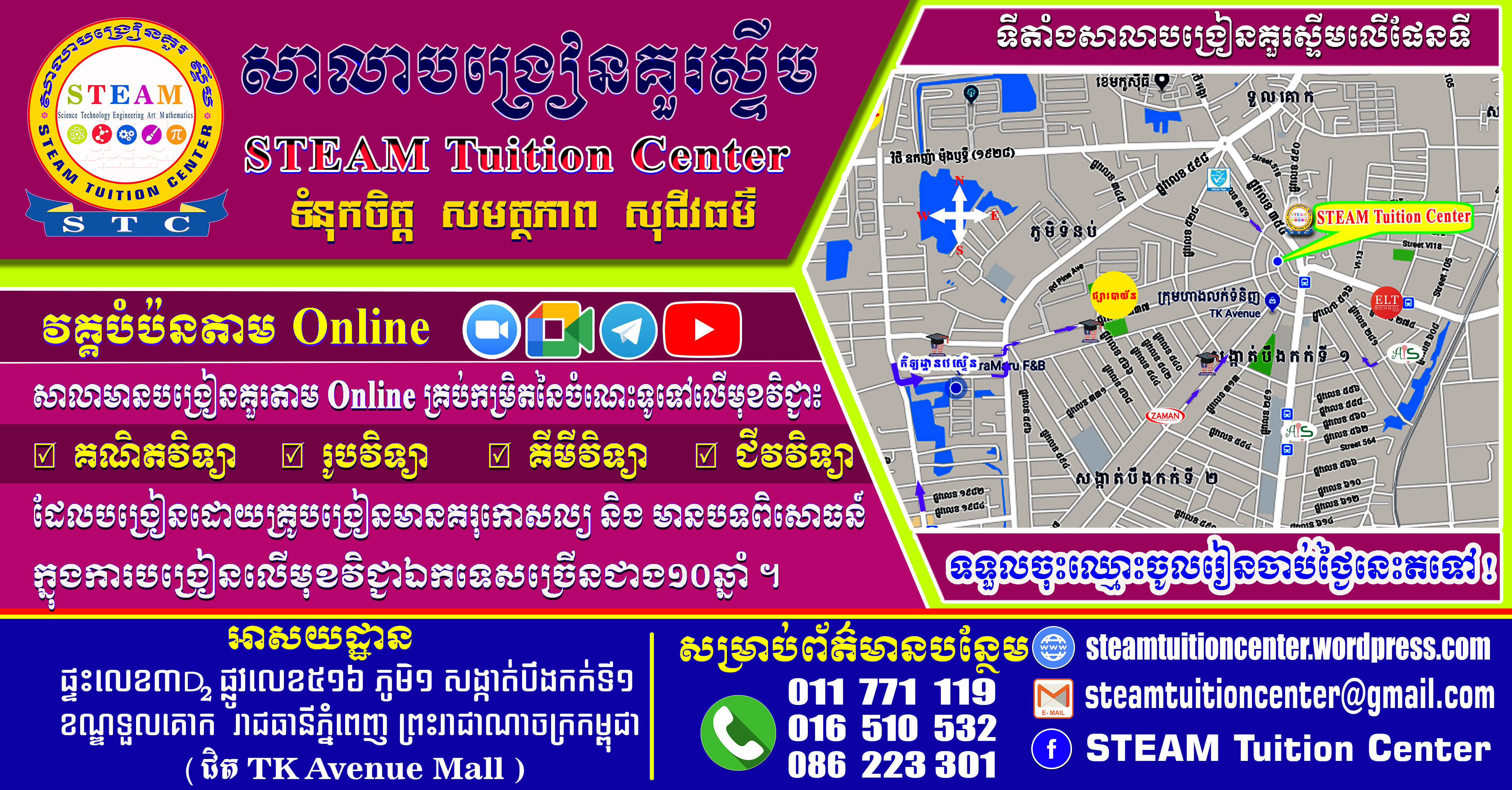 STEAM Tuition Center មានបង្រៀនគណិតវិទ្យា រូបវិទ្យា គីមីវិទ្យា និងជីវវិទ្យា គ្រប់កម្រិតនៃចំណេះទូទៅ។