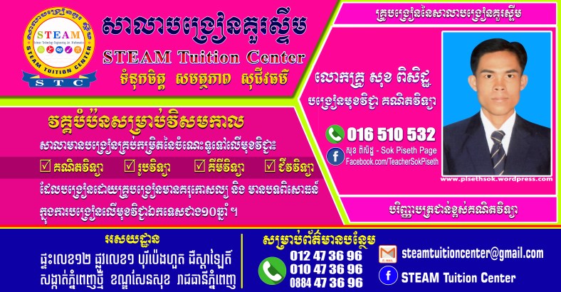 ជាគ្រូបង្រៀនគណិតវិទ្យា ជាម្ចាស់ប្លុកនេះ និង ជា admin នៃ FB page : សុខ ពិសិដ្ឋ – Sok Piseth