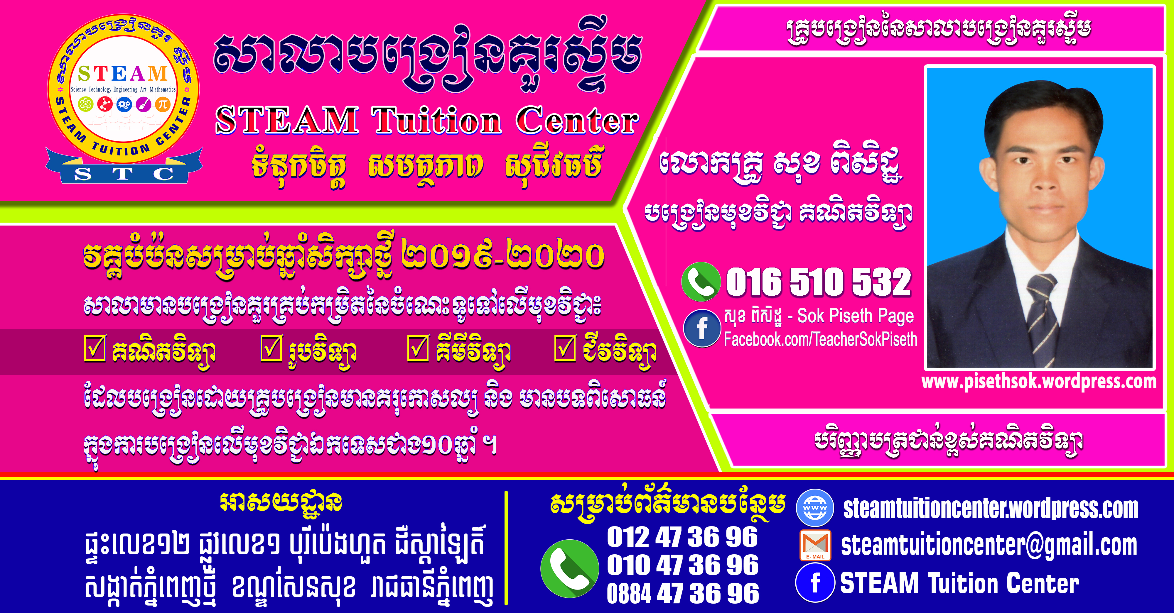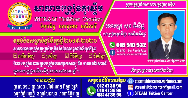 ជាគ្រូបង្រៀនគណិតវិទ្យា ជាម្ចាស់ប្លុកនេះ និង ជា admin នៃ FB page : សុខ ពិសិដ្ឋ – Sok Piseth Page