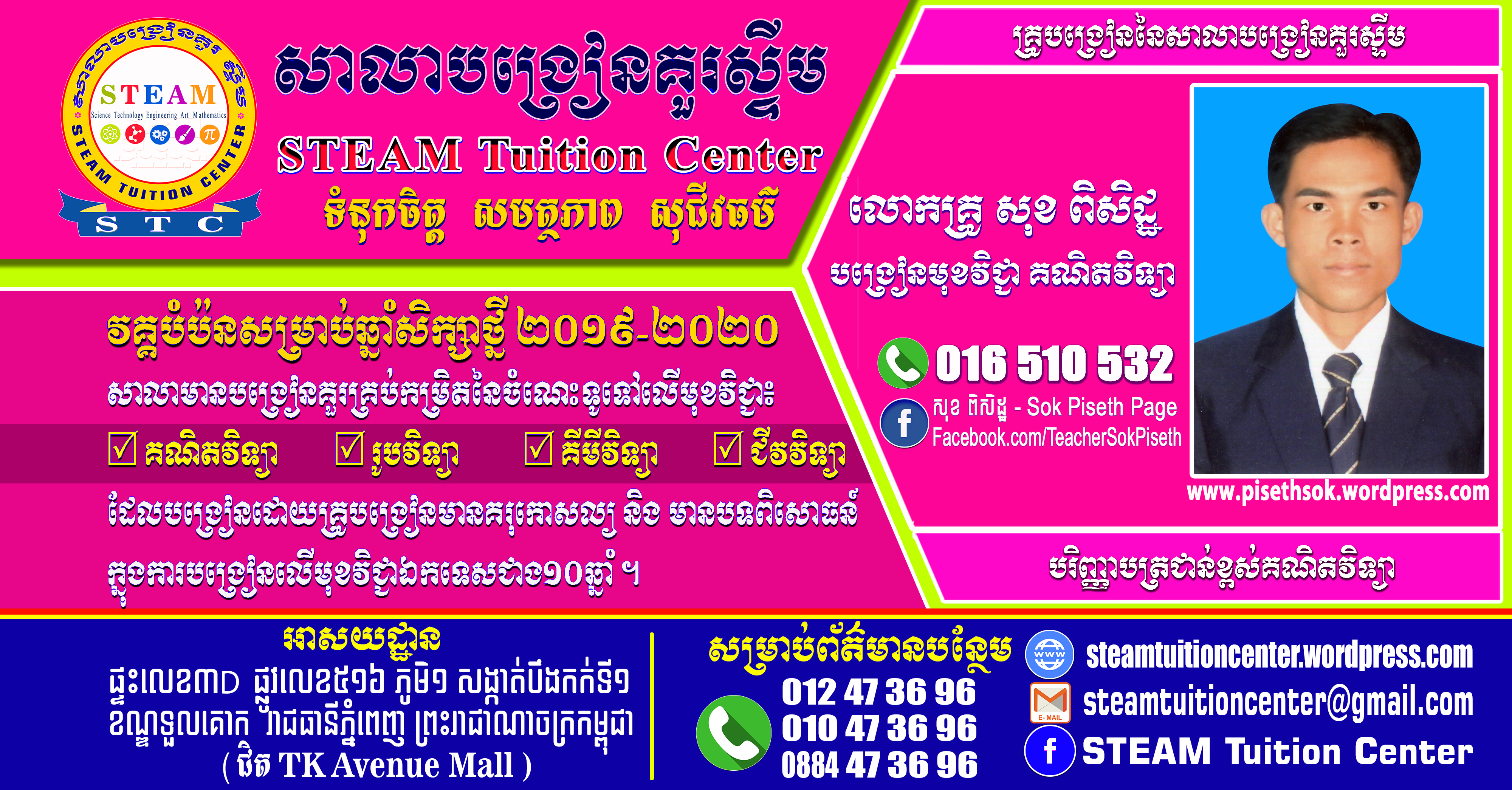 ជាគ្រូបង្រៀនគណិតវិទ្យា ជាម្ចាស់ប្លុកនេះ និង ជា admin នៃ FB page : សុខ ពិសិដ្ឋ – Sok Piseth Page