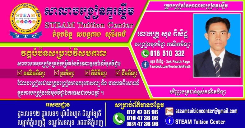 ជាគ្រូបង្រៀនគណិតវិទ្យា ជាម្ចាស់ប្លុកនេះ និង ជា admin នៃ FB page : សុខ ពិសិដ្ឋ – Sok Piseth